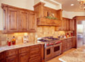 use of dark wood cabinets, granite countertops, porcelain tile, and hand-scraped,